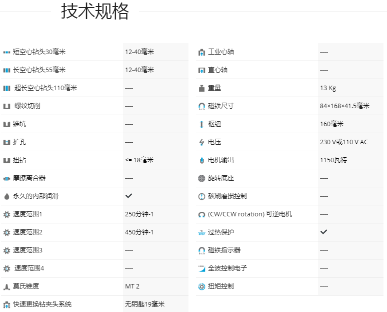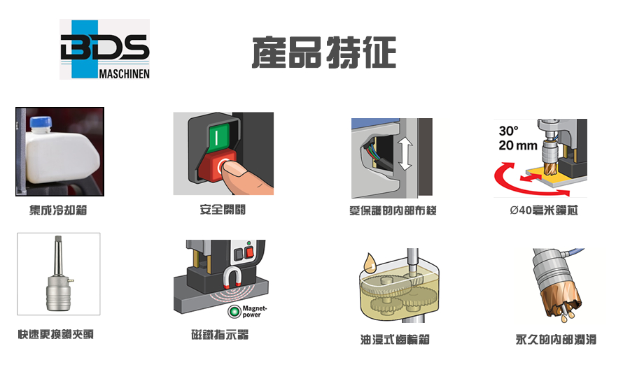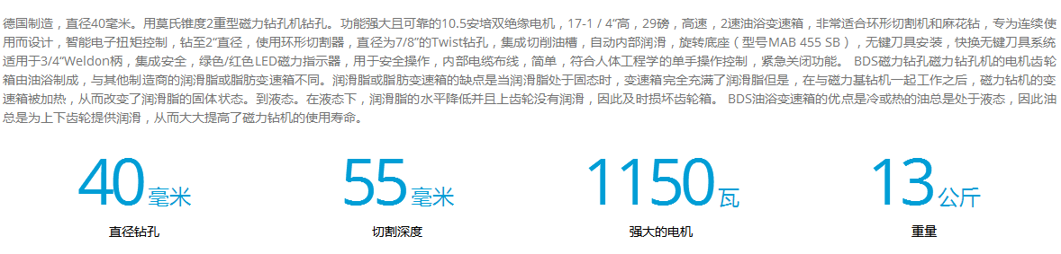 介紹:德國制造,直徑40毫米。用莫氏錐度2重型磁力鉆孔機鉆孔。功能強大且可靠的10.5安培雙絕緣電機,17-1 / 4“高,29磅,高速,2速油浴變速箱,非常適合環(huán)形切割機和麻花鉆,專為連續(xù)使用而設計,智能電子扭矩控制,鉆至2“直徑,使用環(huán)形切割器,直徑為7/8”的Twist鉆孔,集成切削油槽,自動內部潤滑,旋轉底座(型號MAB 455 SB),無鍵刀具安裝,快換無鍵刀具系統(tǒng)適用于3/4“Weldon柄,集成安全,綠色/紅色LED磁力指示器,用于安全操作,內部電纜布線,簡單,符合人體工程學的單手操作控制,緊急關閉功能。 BDS磁力鉆孔磁力鉆孔機的電機齒輪箱由油浴制成,與其他制造商的潤滑脂或脂肪變速箱不同。潤滑脂或脂肪變速箱的缺點是當潤滑脂處于固態(tài)時,變速箱完全充滿了潤滑脂但是,在與磁力基鉆機一起工作之后,磁力鉆機的變速箱被加熱,從而改變了潤滑脂的固體狀態(tài)。到液態(tài)。在液態(tài)下,潤滑脂的水平降低并且上齒輪沒有潤滑,因此及時損壞齒輪箱。 BDS油浴變速箱的優(yōu)點是冷或熱的油總是處于液態(tài),因此油總是為上下齒輪提供潤滑,從而大大提高了磁力鉆機的使用壽命。