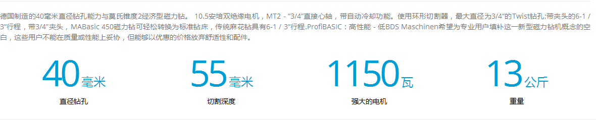 介紹:德國制造的40毫米直徑鉆孔能力與莫氏錐度2經濟型磁力鉆。 10.5安培雙絕緣電機,MT2 - “3/4”直接心軸,帶自動冷卻功能。使用環形切割器,最大直徑為3/4“的Twist鉆孔;帶夾頭的6-1 / 3“行程,帶3/4”夾頭,MABasic 450磁力鉆可輕松轉換為標準鉆床,傳統麻花鉆具有6-1 / 3“行程.ProfiBASIC:高性能 - 低BDS Maschinen希望為專業用戶填補這一新型磁力鉆機概念的空白,這些用戶不能在質量或性能上妥協,但能夠以優惠的價格放棄舒適性和配件。