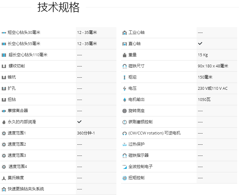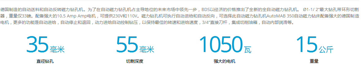 介紹:德國制造的自動送料和自動反轉磁力鉆孔機。為了在自動磁力鉆孔機占主導地位的未來市場中領先一步,BDS以經濟的價格推出了全新的全自動磁力鉆孔機。 ?1-1/ 2“最大鉆孔帶環形切割器,重量僅33磅。配備強大的10.5 Amp Amp電機,可提供230V和110V。磁力鉆孔機可執行自動進給和自動反向,可選擇此自動磁力鉆孔機AutoMAB 350自動磁力鉆床配備強大的德國制造電機,更多的功能是自動進給,自動停止和退回,動力進給自動控制鉆壓,以保持最佳的轉速和進給速度,3/4“直接刀桿,集成切削油箱,自動內部潤滑等。